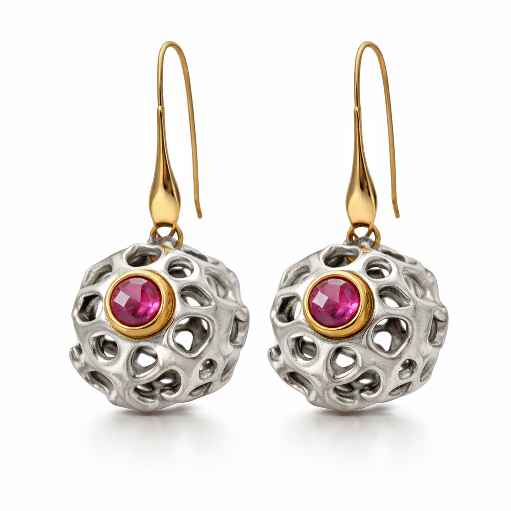 The spherical openwork form creates an architectural structure that plays with light and shadow, while the vivid pink tourmaline gemstone is framed in a refined gold-plated bezel, offering a striking contrast against the silver surface.